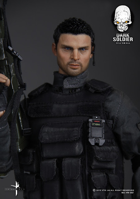 VTS VM-007 1/6th scale Dark Soldier 12-inch Figure aka Karl Urban as Staff Sergeant John "Reaper" Grimm will come with 1/6th scale real-like head sculpt, 12-inch figure body with long-sleeved T-shirt (black), combat suit, tactical vest, universal pouch (small), magazine pouch, universal pouch (large), ammo pouch, tactical belt, elbow pads (one pair), knee pads (one pair), half-finger tactical gloves (one pair), walkie-talkie radio, combat knife with scabbard, drop-leg holster, pistol, sci-fi assault rifle, rifle sling, radio communications headset, combat boots (one pair)